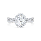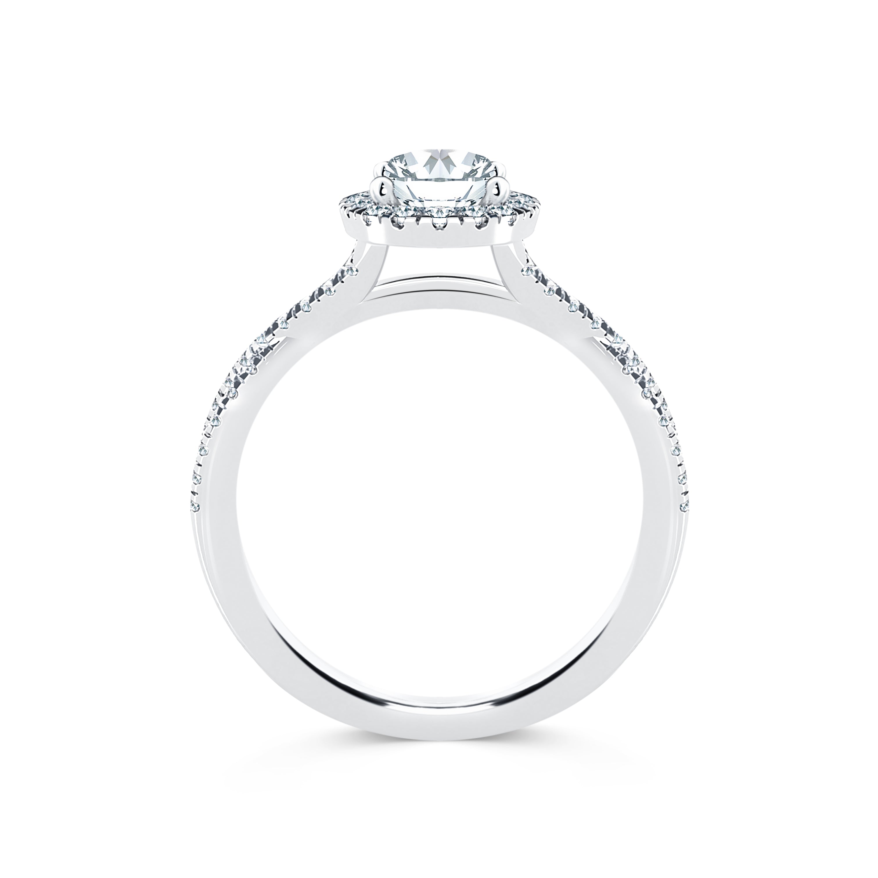 Encircling the central gem is a stunning round brilliant-cut diamond halo, creating a radiant display of brilliance and romance. Adding a unique twist, the diamond-adorned band features delicately set round brilliant-cut diamonds that symbolise the intertwining journey of two lives, blending modernity with classic elegance.