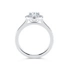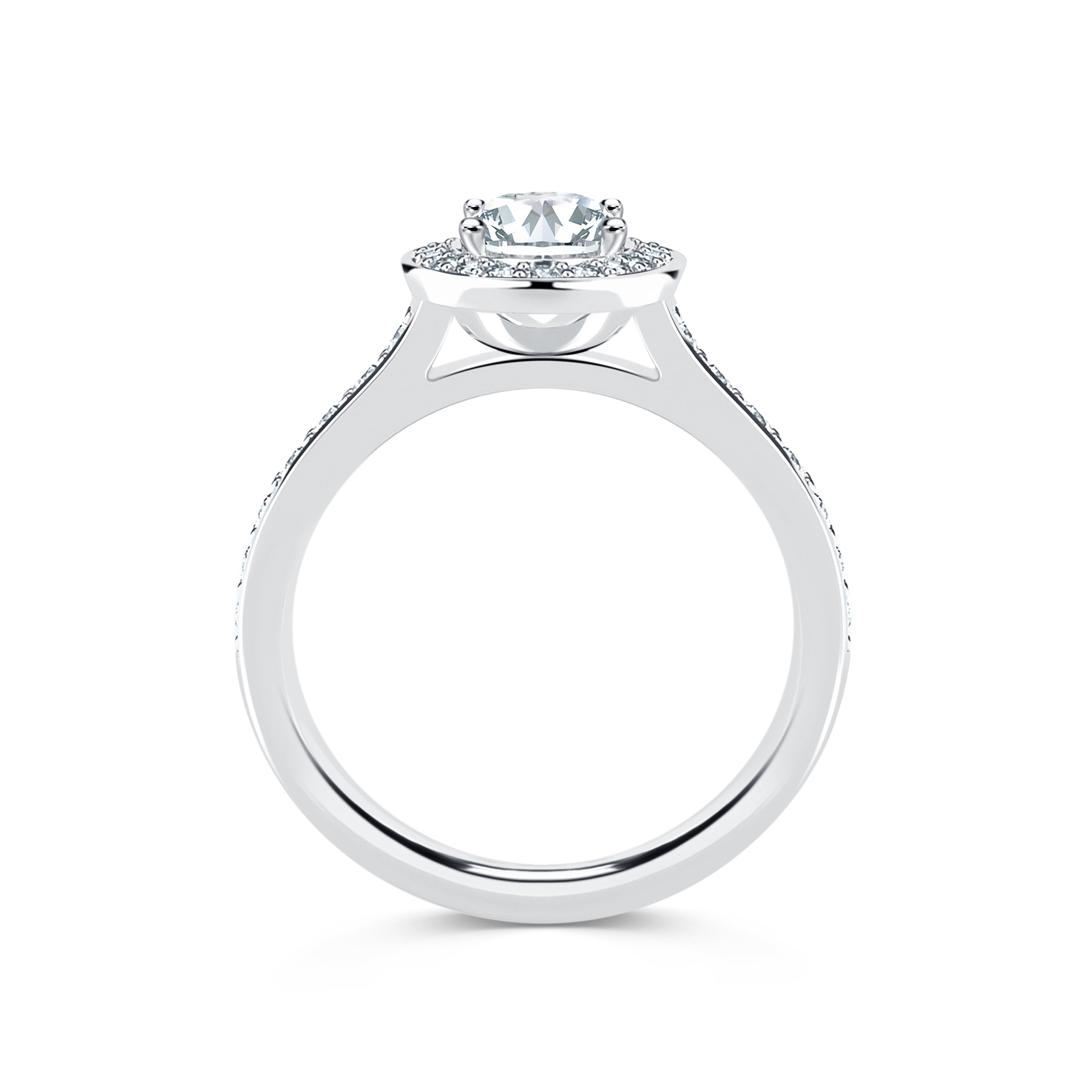 Encircling the centre diamond, a stunning grain-set bezel diamond halo adds a celestial sparkle, reminiscent of the beauty of the night sky. The intricately designed band, adorned with additional grain-set diamonds, enhances the ring’s brilliance and sophistication, symbolising the eternal nature of your commitment.