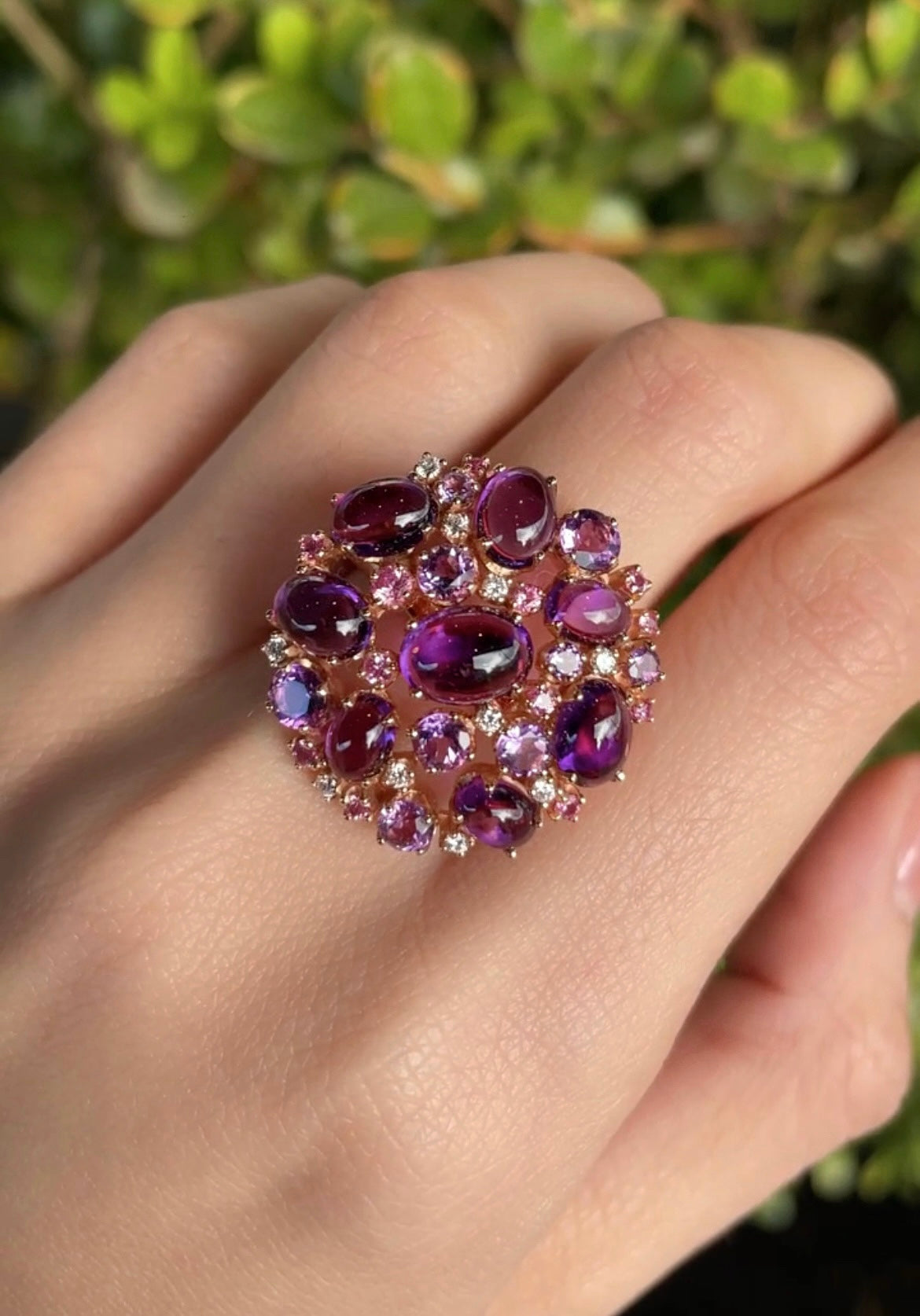 This Amethyst & Pink Sapphire Ring is a statement piece crafted in 18ct yellow gold, designed to dazzle with its vibrant colour palette and refined craftsmanship. The two-tone Amethyst cabochons (6.61ct) offer rich, bold hues, complemented by the delicate sparkle of 0.31ct pink sapphires and 0.15ct of diamonds, all set in a beautifully balanced design.