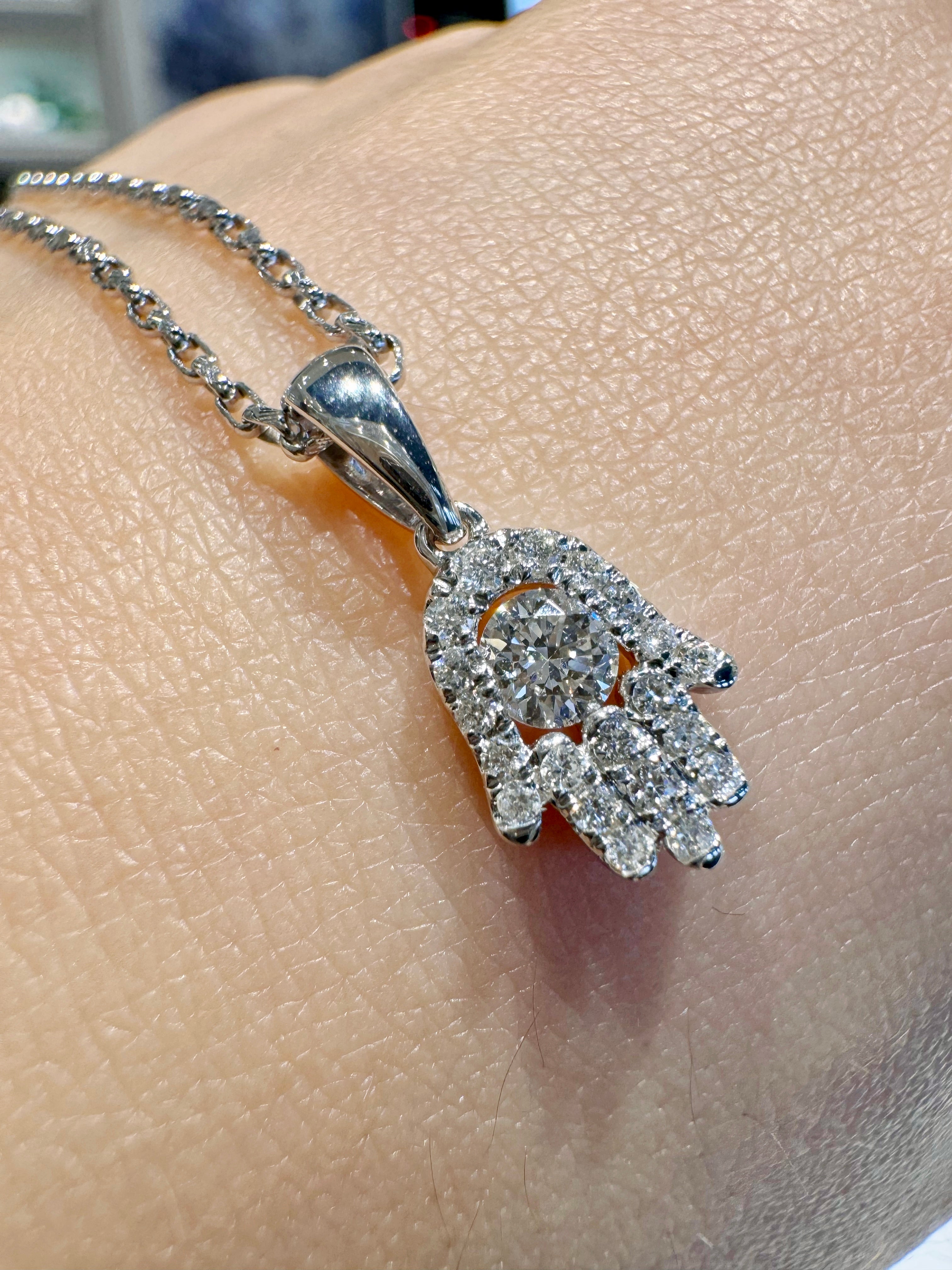 This Diamond Hamsa Pendant is crafted in 18K white gold and features 21 round brilliant cut diamonds, with a total weight of 0.26ct, adding a radiant touch of elegance to the symbolic Hamsa design. A timeless piece that combines spiritual meaning with high-quality craftsmanship.
