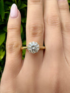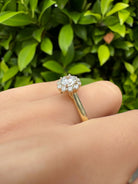 The Daisy Engagement Ring is a timeless symbol of love and happiness, featuring a brilliant round-cut centre diamond surrounded by a radiant halo of round brilliant diamonds. Inspired by the delicate beauty of a daisy flower, this design captures the essence of joy and enduring commitment.