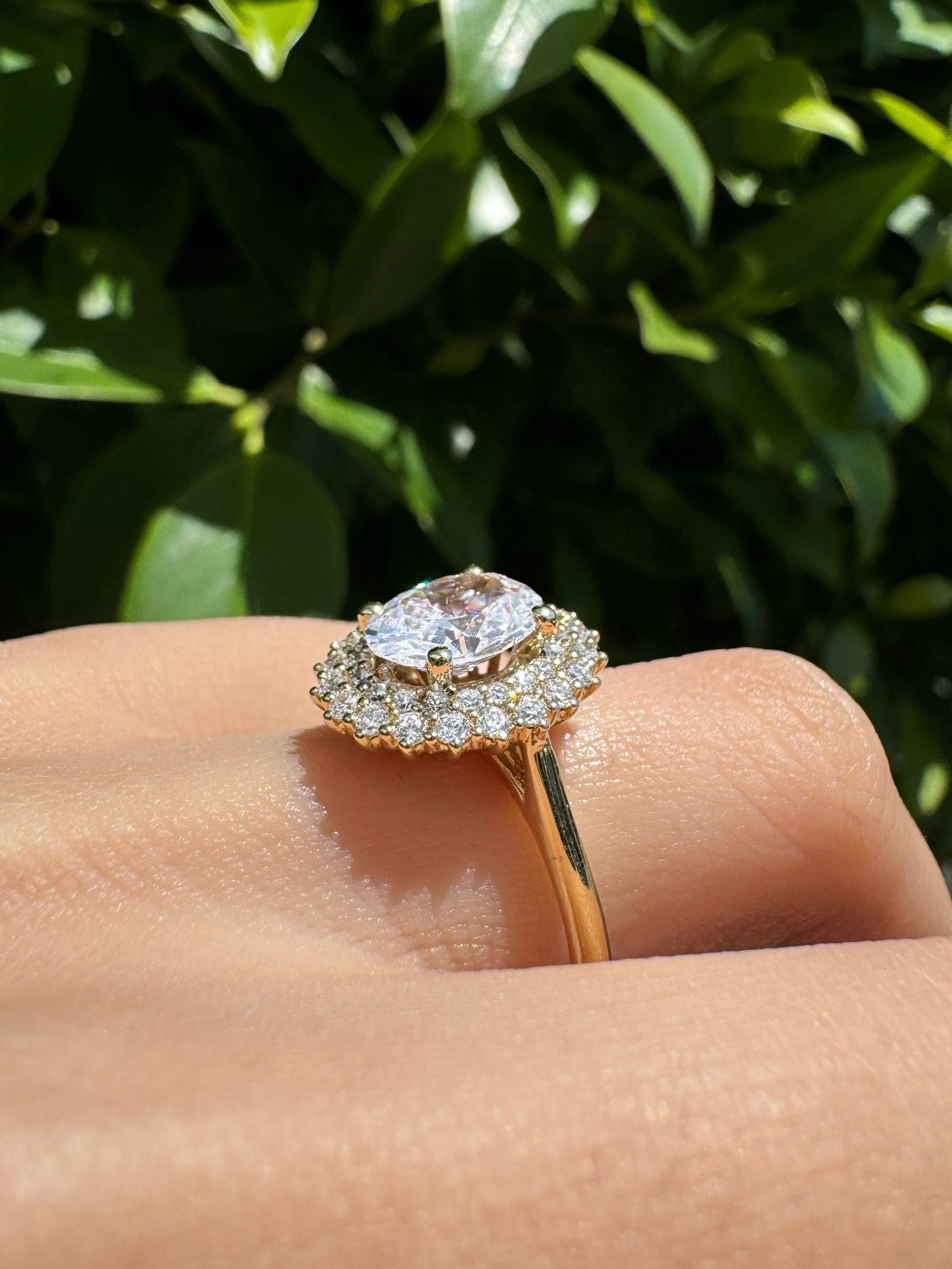 Surrounding the centre diamond, the double diamond halo amplifies the ring’s sparkle, creating a mesmerising interplay of light. The meticulous shared claw setting ensures a seamless and sophisticated finish, blending traditional elegance with modern allure.