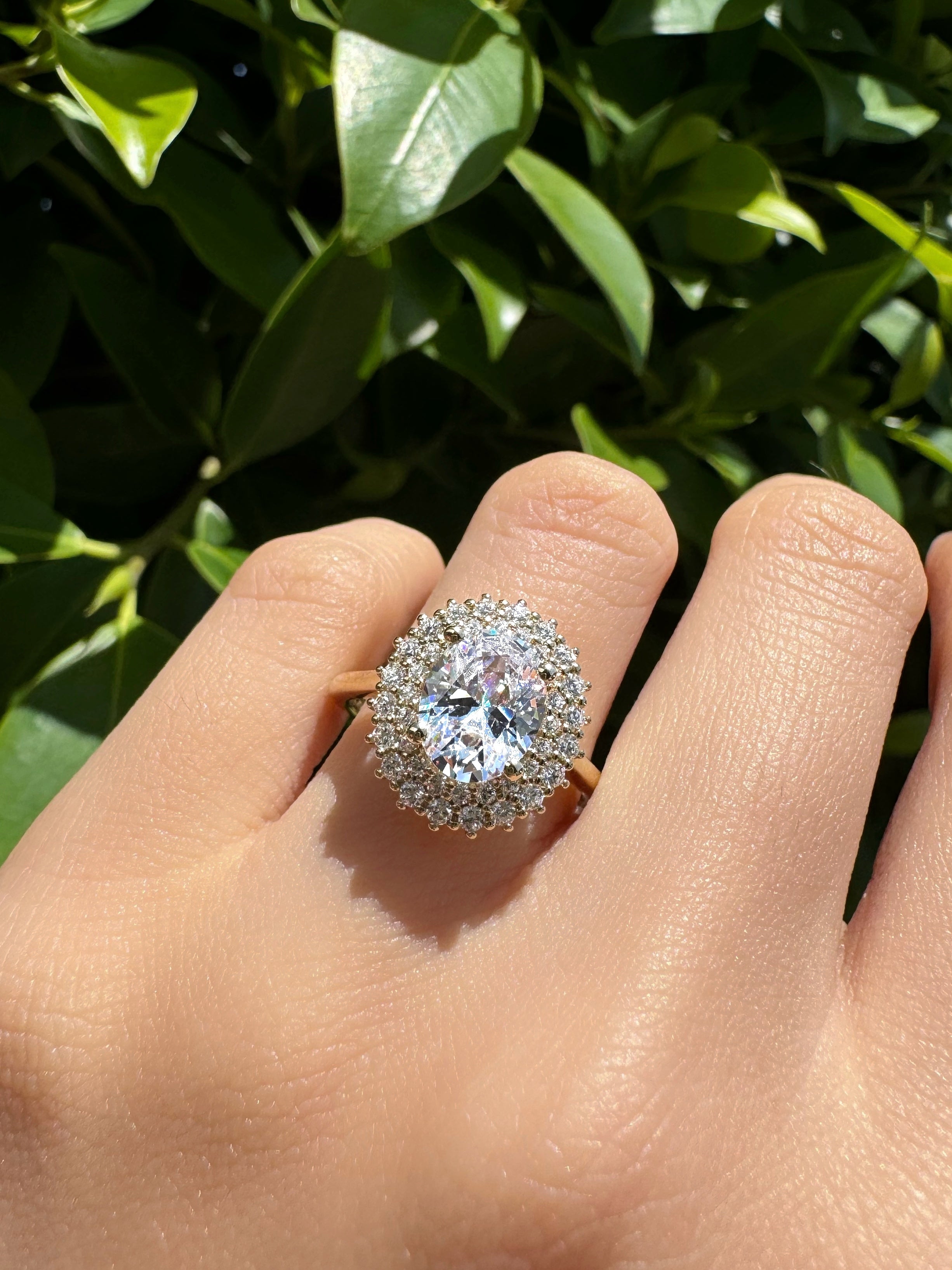 The Meredith Engagement Ring is a radiant embodiment of timeless sophistication. Crafted in warm yellow gold, this exquisite design features a stunning oval-cut diamond at its centre, embraced by a dazzling double halo of round brilliant-cut diamonds. The shared claw setting adds a contemporary touch, enhancing the brilliance of this classic piece.