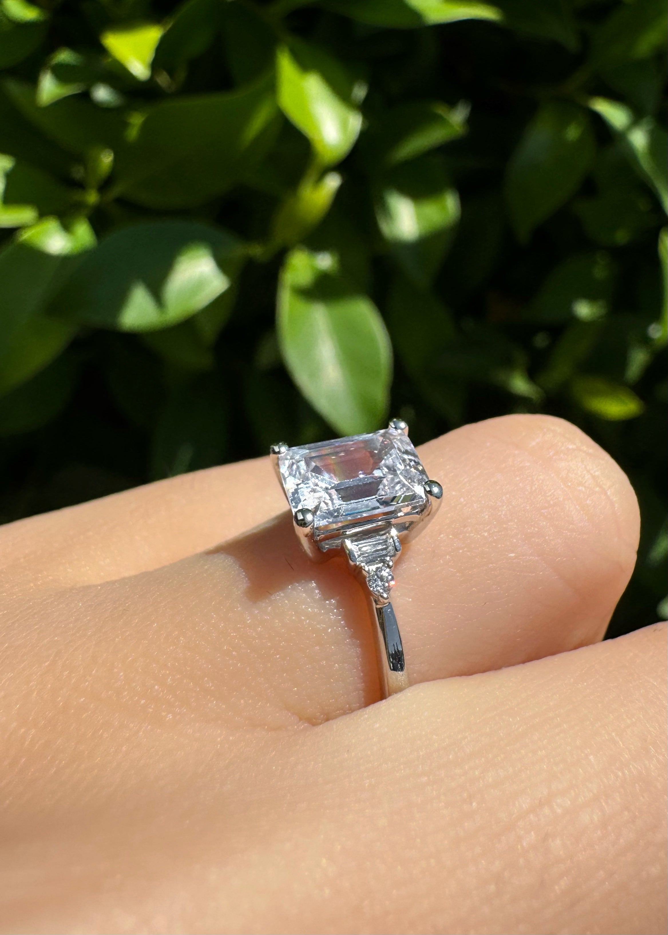 The emerald-cut centre diamond exudes classic sophistication and clarity, symbolising the enduring beauty of your love. Flanking the centre stone, two emerald-cut side stones are set in a parallel arrangement with a delicate bar setting, allowing each diamond to shine individually while creating a cohesive, modern aesthetic.