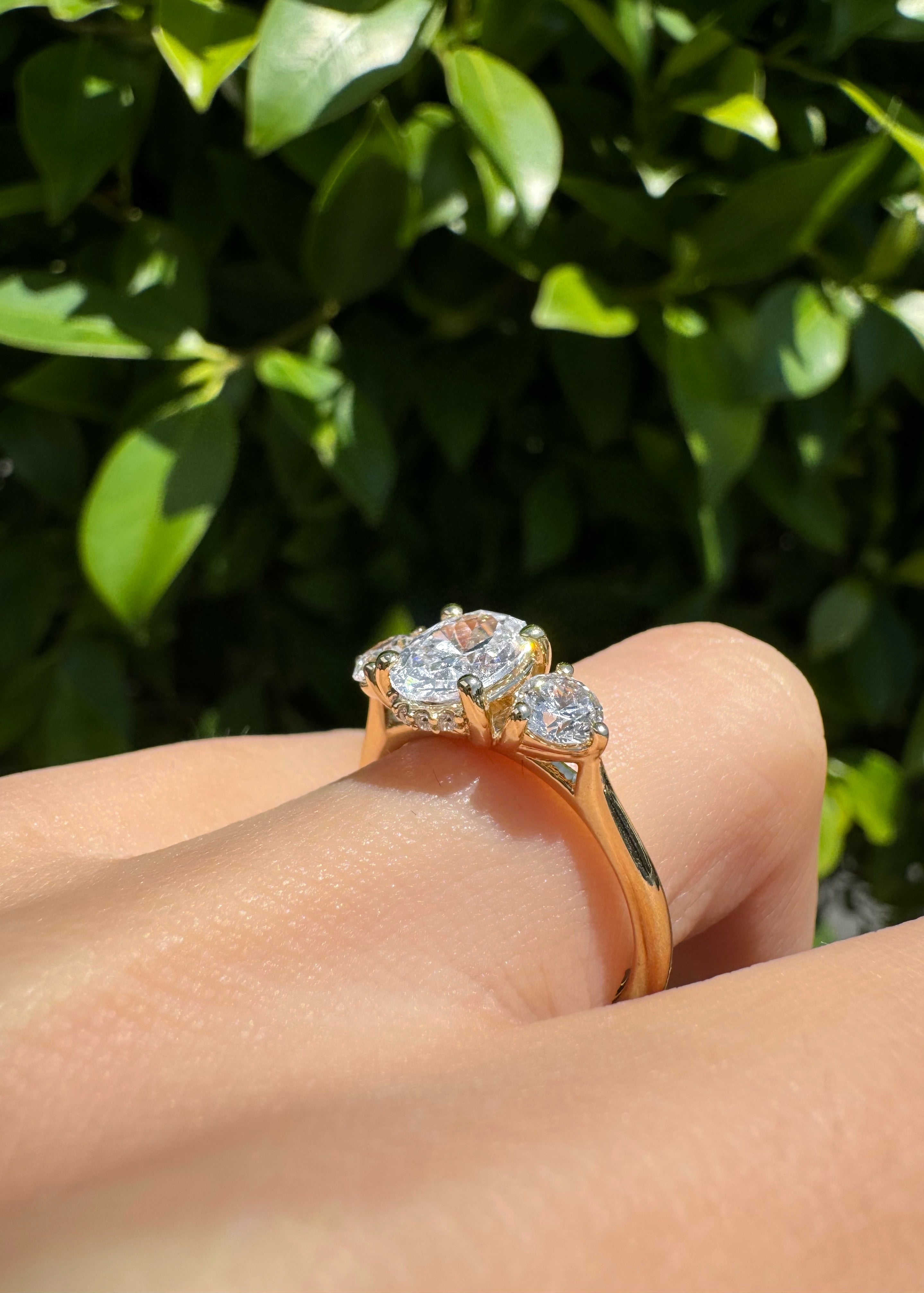 The Klara Engagement Ring is a captivating trilogy design that perfectly balances timeless grace and modern sophistication. Featuring a stunning oval-cut centre diamond cradled in a secure 4-claw setting, this exquisite ring is complemented by a unique diamond under-halo and two round brilliant-cut side stones, creating a radiant symbol of enduring love.